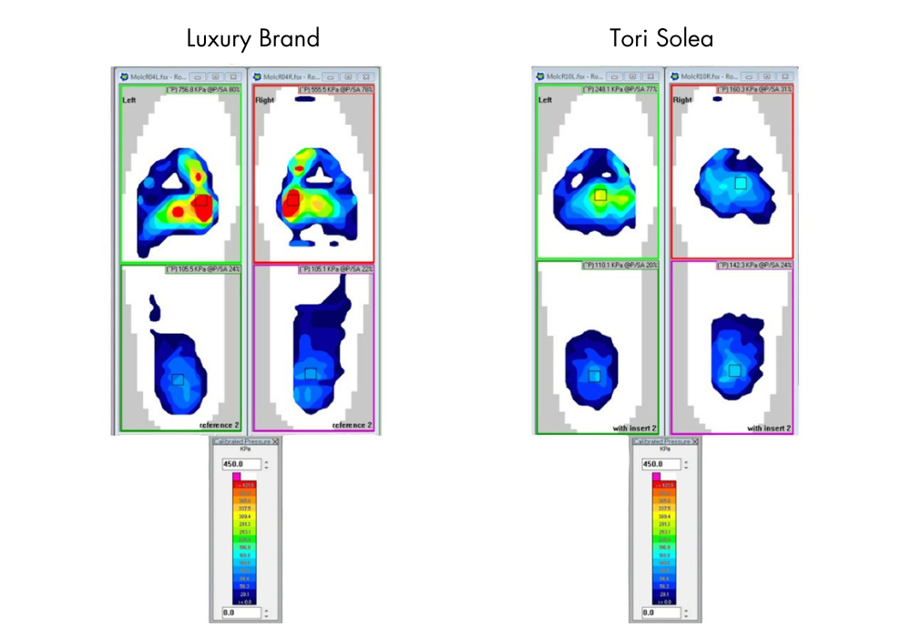 As shown in the image, where the blue represents areas of low pressure and the red represents areas of high pressure, our heels provide increased comfort in underfoot pressure, compared to a leading designer brand.